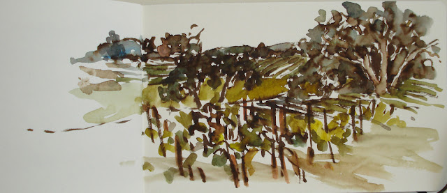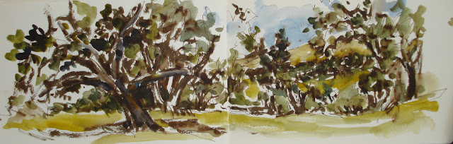 At the last winery, I let everyone else go taste and I just drew. Vines are in the foreground and the oaks with their dark foliage are a wonderful contrast to the warm tones of the vines and golden hills.