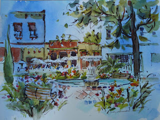 Recently I found a brush pen with sepia ink and I like the warmer tones of the brown ink. Here is one of the most recent, a painting of the southwest quadrant in Old Towne Orange’s Plaza Square. In this case the under-painting in blue was done before I went out to paint. I find that I like the results better if the under-painting is done with no thought of the subject matter to be superimposed on top. When I begin to draw, I watch the placement of the shapes to make best use of the lighter areas and draw directly in ink. My brush pen basically goes for a dance across the page and my drawings are more fluid with this technique. Watercolor is applied when the line drawing is complete and if done immediately the ink blends with the watercolor. If you wait a number of days, the ink is set and washes can be applied across the line with no bleeding. You lose the variation in edge quality however.