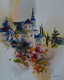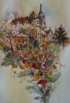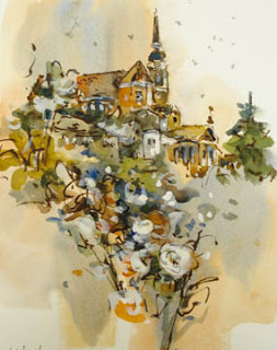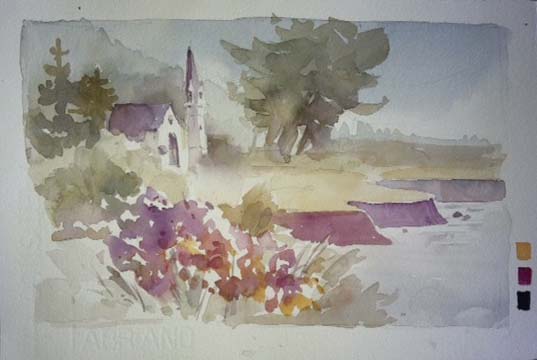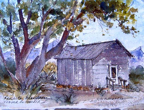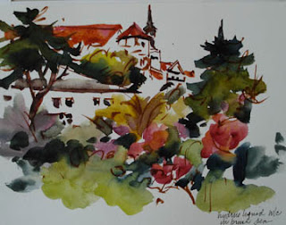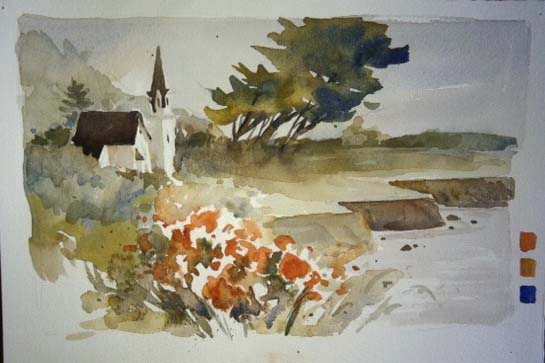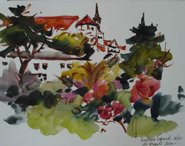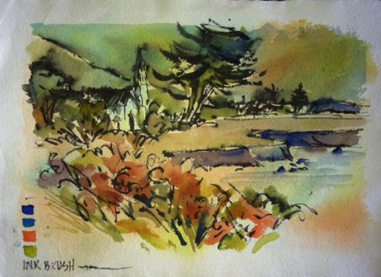 Not much written on this page…it was done from the front seat of the car on a rainy, stormy day. That somber light was part of the reason that the mustard was so bright. The sketching trip with my friend Brenda Swenson turned into an exercise in painting in spite of the weather. We painted in the car, in our room and even in a mall. Now that is desperate! But then we do that. We’ve also painted in 110 degree heat.