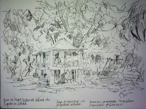 I got elected to keep a journal of a trip to several islands in French Polynesia with 5 other artists in 1985. At the beginning I made the pages more writing and less drawing. That changed over the course of the trip. As is somewhat common, this sketchbook has a recipe included. Food has a way of creeping into my journals.