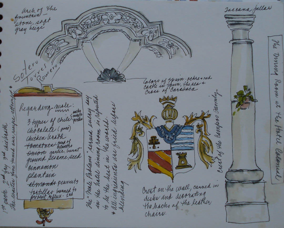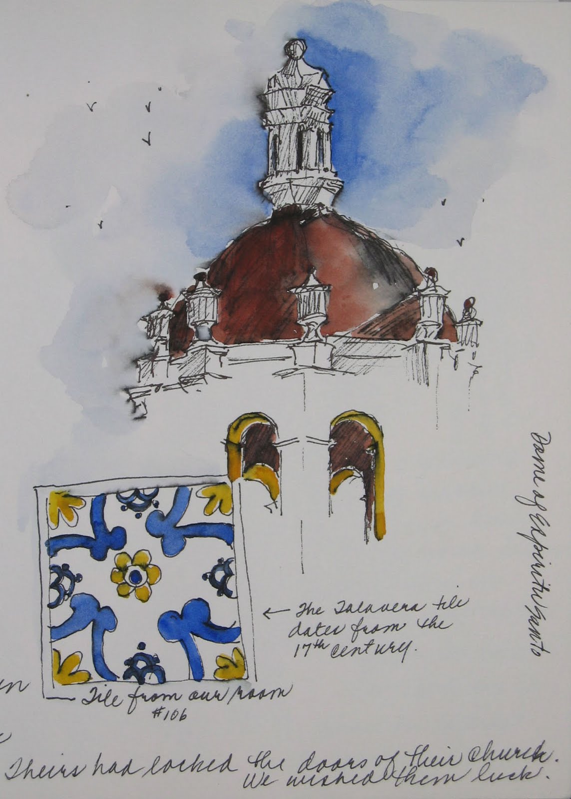 Sometimes just looking out the window is the prompt for a page in your journal. The bell tower and a Talavera tile from our room was enough for this page. Journals have room for interesting bits of information gathered along the way. There were a group of people from a small village sitting together in protest about their bishop. Apparently they had been locked out of there church and they wanted to be heard. I would have forgotten that had it not been for this journal.