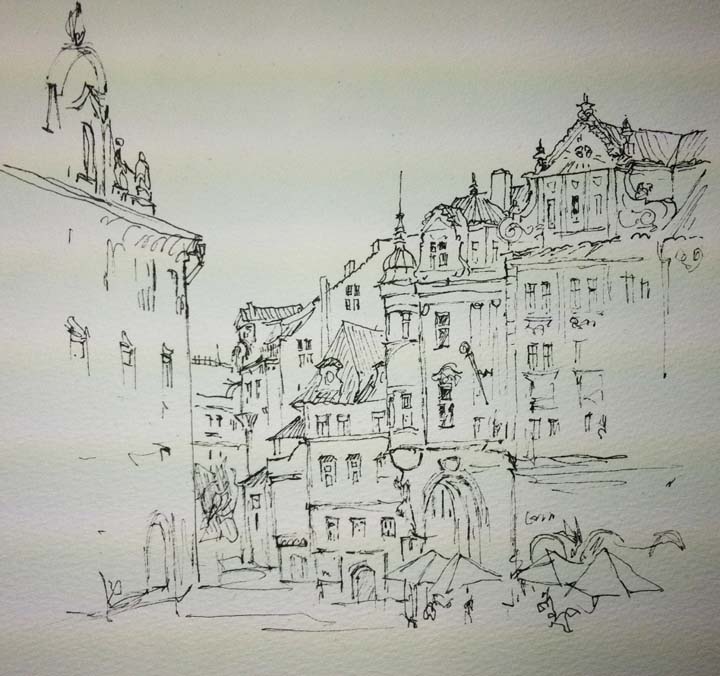 It was hot so my husband and I took shelter beneath the spreading trees on Las Ramblas and had a cold drink. Several of the pages in this sketchbook were as a result of a stop to rest, get hydrated or other needs. We were in Barcelona for the Olympic Games in 1992. Most drawings are more like a snapshot than any sort of a complete watercolor sketch. I kept ticket stubs and have photos but this is my favorite way to remember.