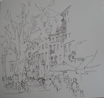 We took in our sketchbooks, a small watercolor palette and waterbrushes. These brushes are filled with water and when you change color, you squeeze out some water to cleanse the bristles. The two drawings here were done in that way. The colors are amazingly clear and un-muddied. The brushes are available at most art supply stores and on-line suppliers – my favorite are those made by Niji.
