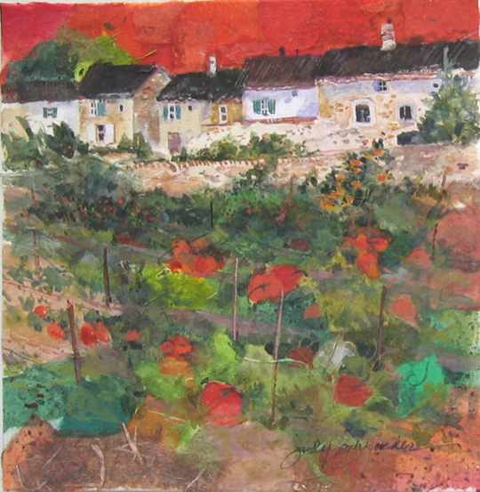 | After the first step is thoroughly dry, the painting is finished with both watercolor and white gouache. The final version is pulled together by the painting process and is enhanced by the wonderful colors and texture provided by the collage beneath. In this one, I was slightly worried that I’d made a hash of the first step. It was so “clunky” compared to what I had in mind. |