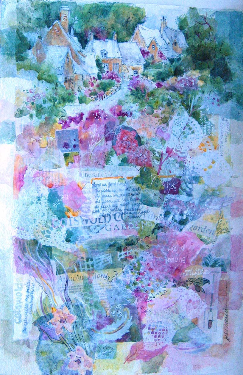 The upper image is of Bibury, Cotswolds, England. It was the home of wool weavers long ago and is rumored to be the most photographed spot in England. I love the way the houses hug the hill, each reflecting the lovely golden Cotswold stone. The lower 2/3rds is composed of all the aforementioned gatherings from my trip. There are doilies, photographs, words from newspapers, written words and fascinating words from signage.