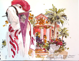 We took in our sketchbooks, a small watercolor palette and waterbrushes. These brushes are filled with water and when you change color, you squeeze out some water to cleanse the bristles. The two drawings here were done in that way. The colors are amazingly clear and un-muddied. The brushes are available at most art supply stores and on-line suppliers – my favorite are those made by Niji.
